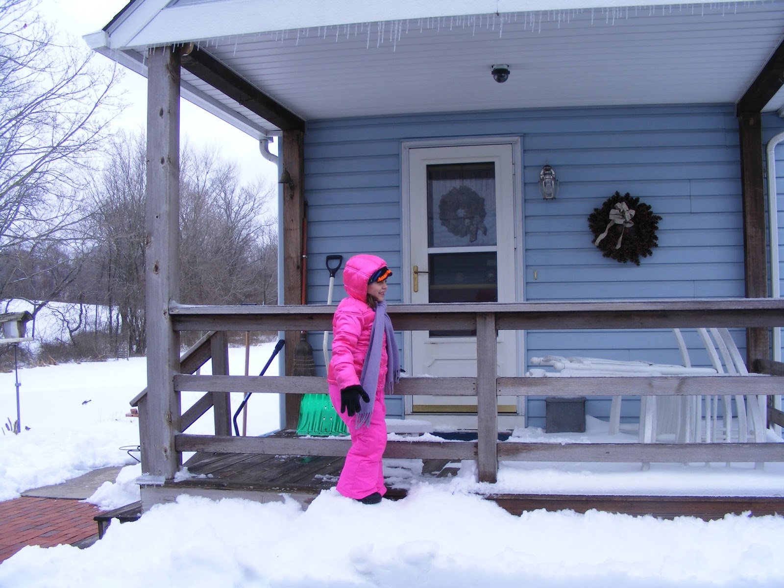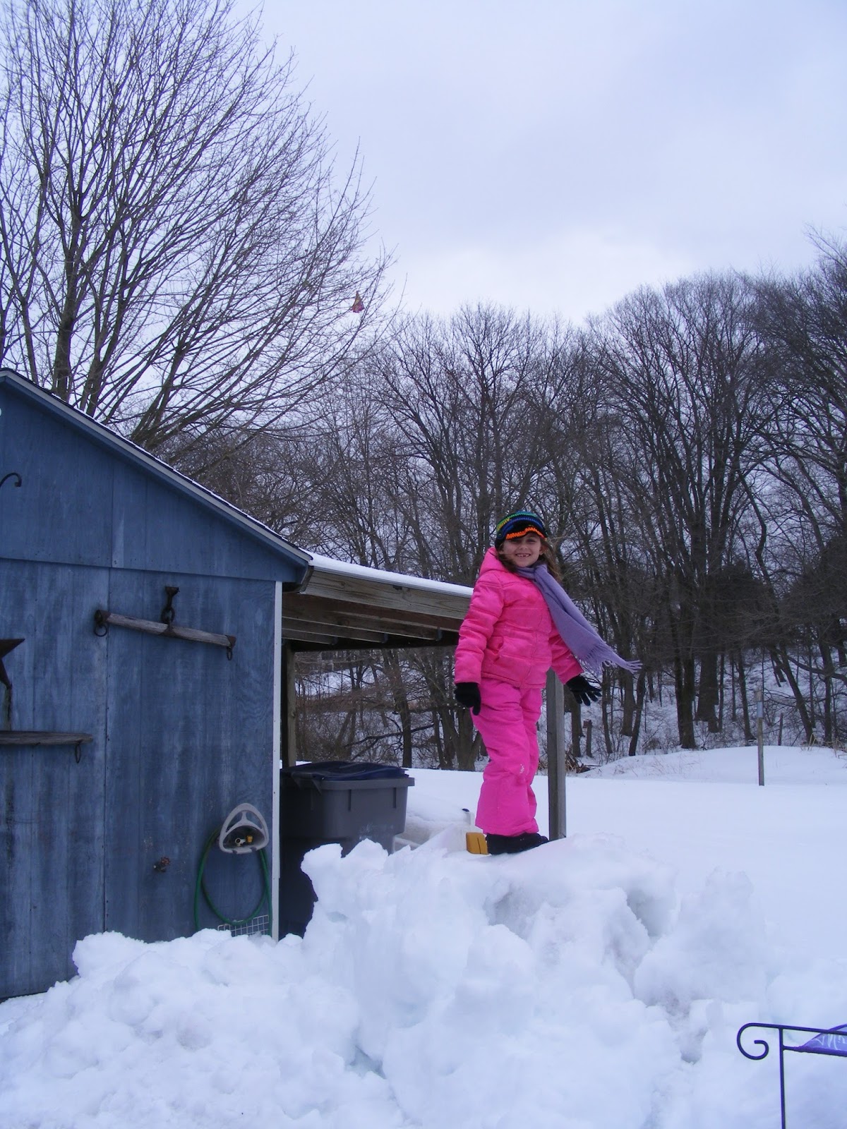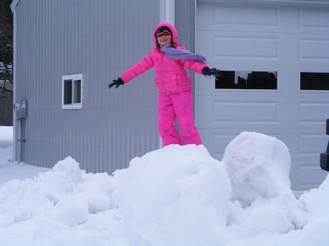 And here are a few snow photos...even though technically we didn't get that much, when it's all plowed up in a pile, it seems like a lot! Here is my little "queen of the hill".....her scarf is blowin' in the wind, I think it must have been about 40 mph! You can see a portion of my little garden flag in the lower right hand corner....it is straight out!