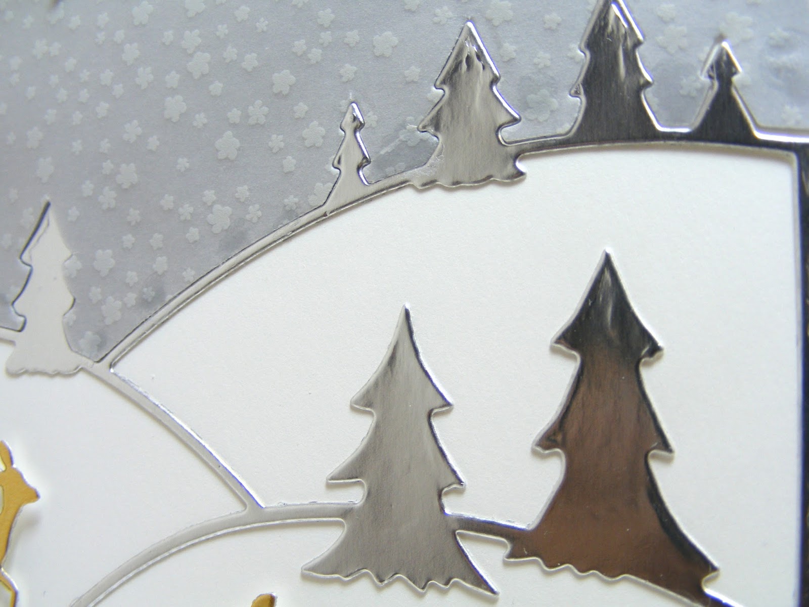 Happy Friday, peeps, and Happy St Pat's! I hope you have something fun planned to do this weekend! I haven't made a Christmas card for a while, and the photo challenge at Christmas Card Challenges inspired me to get out my gold and silver foil cardstock! The photo is hard to see, but there are prancing deer and Christmas trees featured on some gift wrap.