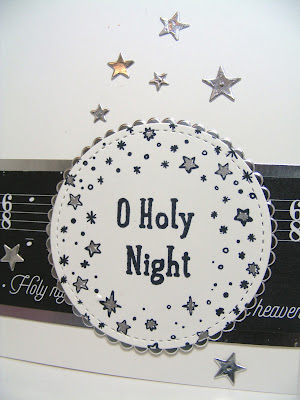 I recently got this pretty stamp set from CTMH called Prince of Peace; I stamped it with Memento Black ink, diecut it with a stitched circle die and matted it with some silver foil: