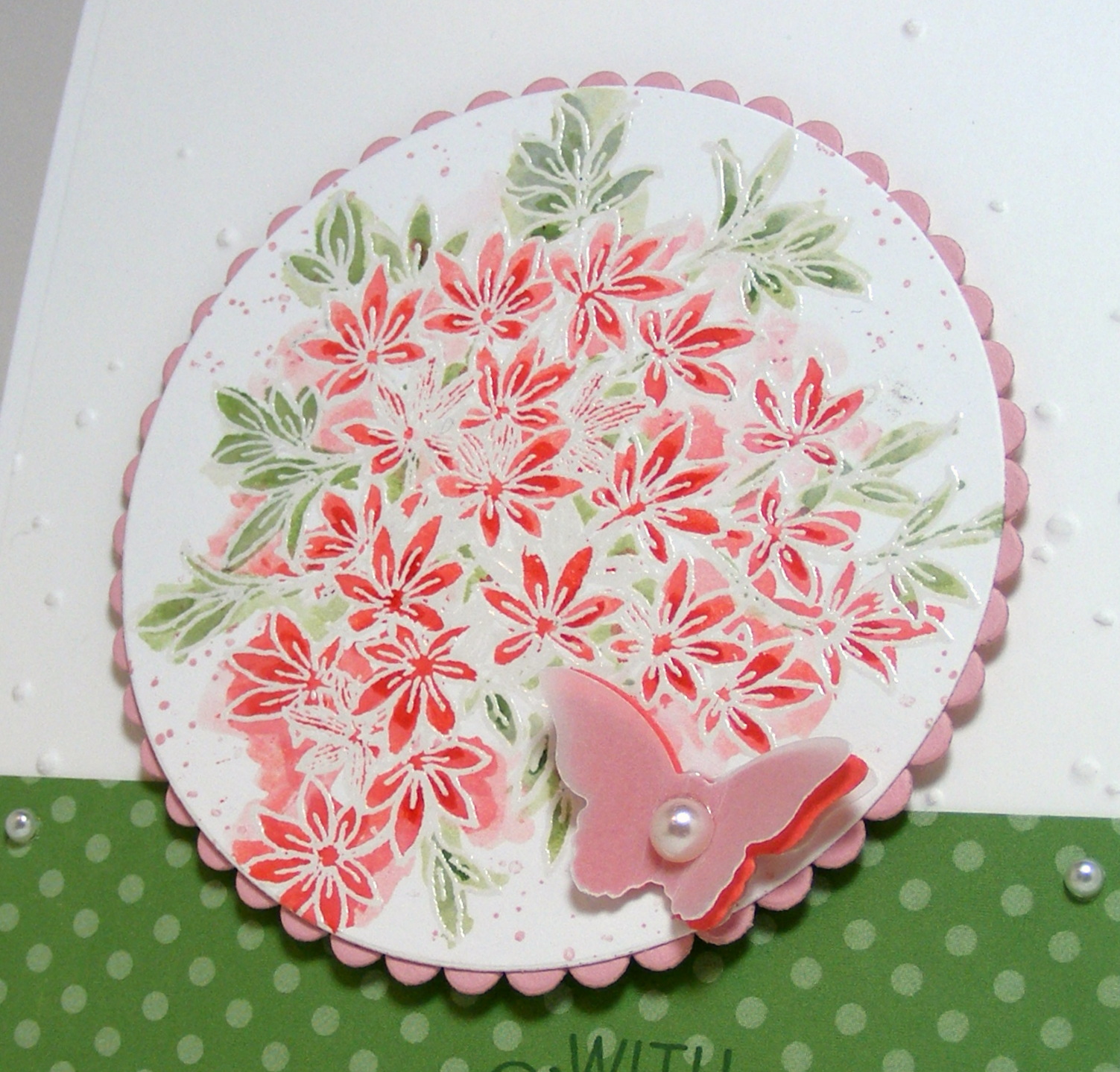I used Calypso Coral and Wild Wasabi inks to color in my embossed image, letting the color wash around the outside of the florals as well: