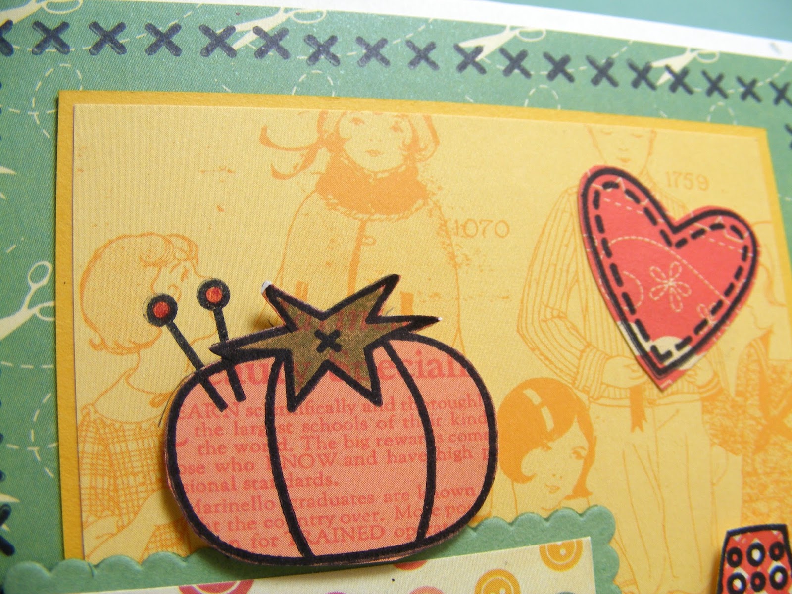 I didn't do a romantic or traditional Mother's Day card...my mom and grandmothers are all gone so it's not a holiday for which I traditionally make cards! One thing I do remember about my mom and my grandmother, is that they both passed along a love of needle arts to me. So I thought a sewing-themed card would be fun! Not only did I use some retro stamps, I used some retro papers as well! I pulled out some really old Cosmo Cricket papers from the Material Girl line, along with a Paper Smooches set called Needle Little Love, which I believe is from 2014: