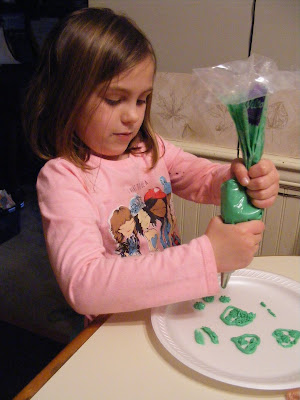 Monday was a school holiday as well as our anniversary and Wayne's birthday, so we decided to make a cake for him.....since he is a Philadelphia Eagles fan, Cassidy insisted that we make green icing for the decoration! Here she is, with the decorator bag; she wanted to make a heart and fill it in, so we did some "practicing" first on a styrofoam plate: