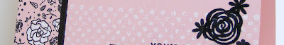 I wanted to use the new In Color, Powder Pink, so I took a sheet of cardstock and stamped the floral image from Wood Words (in the upcoming catalog) in Basic Black ink, masking off one edge, and adding a stripe with my black marker: