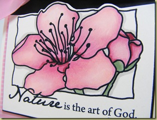 This is a gorgeous digi image from my friend Arielle; it was printed on Very Vanilla and colored with Copics, then simply embellished with pink satin ribbon and some buttons. This was also for the SCS “How Does Your Garden Grow” challenge yesterday.