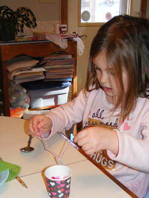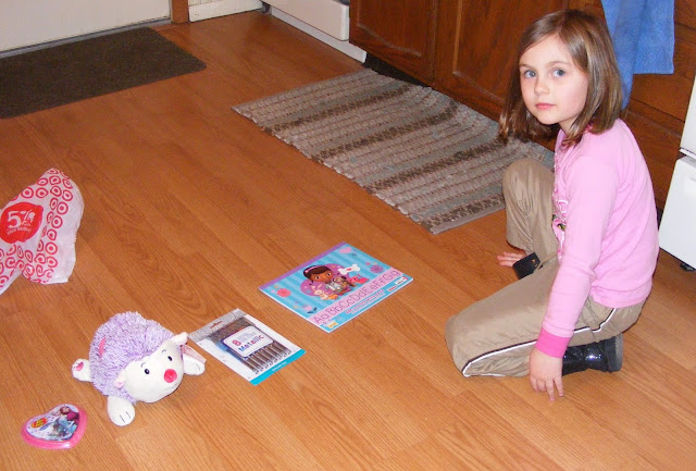 Do you ever get inspiration from pictures or people's clothing (that happens to me in church, LOL!)? I am interested in hearing where others get their inspiration! Thanks so much for popping by today! And I don't think I ever shared this photo from Valentine's, when Cassidy lined up all her gifts. "Lovey" the hedgehog was by far the favorite, almost edging out Lambie for top billing!!!