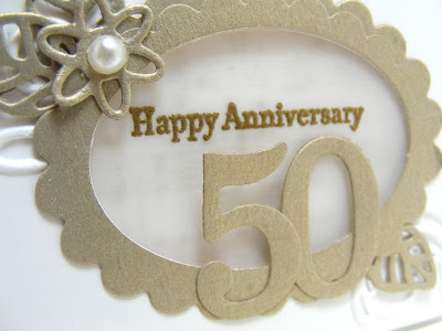 I started with thick white cardstock...I can definitely say that is a favorite, because it accepts ink, embossing and watercoloring very well! Then I found a retired embossing folder which is just lovely, called Elegant Lines, and embossed a white panel to sit atop my card. I know that gold is the color of 50th wedding anniversaries, but I didn't want gold foil, so I still had a few pieces of retired Brushed Gold cardstock and I created a window and a frame for my gold-embossed sentiment from Teeny Tiny Wishes....another versatile, favorite set! It was embossed on vellum, and although you can't see behind it, there is music stamped in gold. My final touches were some gold diecuts from the Flourish Thinlets, numbers from the Timeless Type die, and I added pearl accents to them and the embossed panel as well: