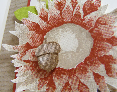 I began by embossing my Very Vanilla note card with a Darice Fall Leaf Background embossing folder. The Pool Party panel was stamped with the woodgrain image from Truly Grateful in Versamark ink and dusted lightly with some old SU pastel chalks to enhance the colors. The Pick a Pumpkin images were ones I had stamped for an earlier project and were still hanging around on my desk, so I added them to a vertical banner of Merry Little Christmas DSP, then stamped a horizontal banner with a "Hello" from last year's fall Paper Pumpkin kit. I also added a little stitched scallop scrap that I had laying on my desk too! Good to clean up and use up those pieces!