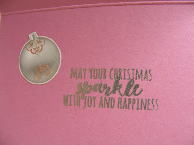 My card base is 4 1/4" square, but I extended the fussy-cut ornaments above the fold, as it will still ft into a standard-sized envelope! When I created this card at about 10pm at night, the Sweet Sugarplum cardstock looked like a match, but I see in my photo, the pinks are a little different...still, it's almost a match! Aren't these silver-embossed baubles beautiful?