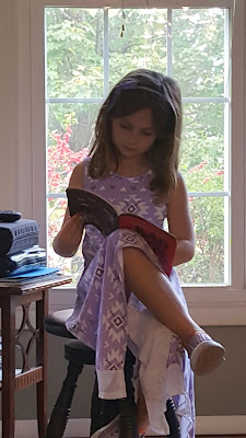 Cassidy's teacher gave everyone in her class a book, so she sat and read it to us!! I love how she crosses her leg, LOL!