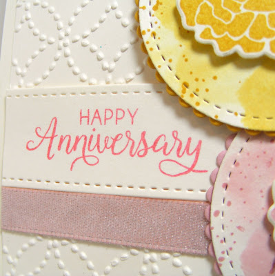 I stamped each of the flowers on Very Vanilla cardstock in Crushed Curry, Flirty Flamingo and Blushing Bride, then cut them out with the matching dies. I swooshed some ink and water in the same colors on some scraps of VV cardstock and cut them out with a Stitched Shape circle die. I added some speckles with Itty Bitty Backgrounds and mounted the florals on with a dimensional. Finally I added a matching scallop layer and mounted them all on a Very Vanilla panel that was embossed with the Quilt Top embossing folder: