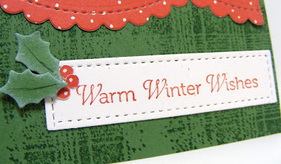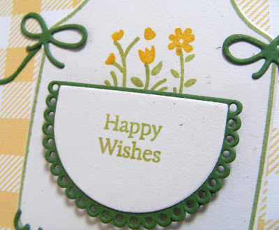 These linens look just like some my mom had growing up!! I was inspired by the plaids as well as the colors for my Apron card! To start, I used some Papertrey Chicken Scratch gingham paper for my background, then stamped my apron in Pear Pizzazz and added a pocket and ties with Garden Green. I am just in love with that little scalloped trim! I added some flowers popping out of the pocket in Pear Pizzazz and Crushed Curry: