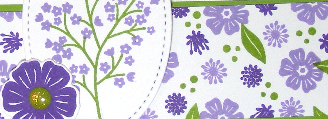I don't have any DSP in purples, so I began by stamping my horizontal panel with floral images from Beautiful Bouquet in Highland Heather, Gorgeous Grape and Granny Apple Green, randomly stamping them to create my own DSP: