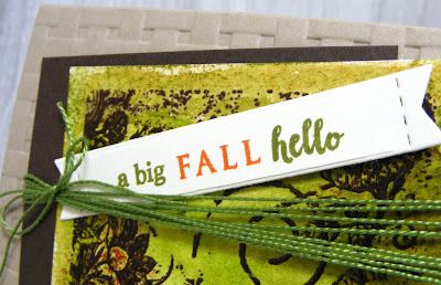 I added a banner with a sentiment, some green perle cotton, then matted it with some Early Espresso and popped it up on a Crumb Cake mat that was embossed with the Basketweave EF: