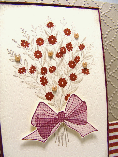 I first embossed my base with the Quilt Top embossing folder; the image was stamped in Crumb Cake and Cajun Craze, and I added the sentiment and bow in Merry Merlot. I distressed the Merry Merlot mat as well, and also sent the stamped panel through the Subtle embossing folder for a little interest. I colored some pearls with a Bronze Blend and added them to the spray:
