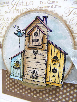 I pulled out one of my favorite SU stamps ever ever ever, Garden Pleasures from 2001. I just love the detailed artwork on these stamps! I stamped the birdhouse in Stazon Black on some watercolor paper and watercolored it in with ink and an aquapainter: