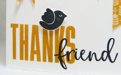 I used Bumblebee for the "thanks" and stamped the friend directly over it....the DSP strips were snipped into banners and I added some black & white baker's twine: